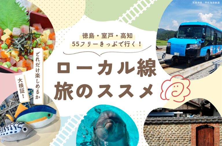 「徳島・室戸・高知55フリーきっぷ」で四国南東部ローカル線の旅!3日間乗り降り自由のお得な周遊切符を使った、移動も観光もまるっと楽しいモデルコースをご紹介します。海の生き物とのふれあいや海鮮グルメ、レトロな町並みなど魅力がたっぷりです。